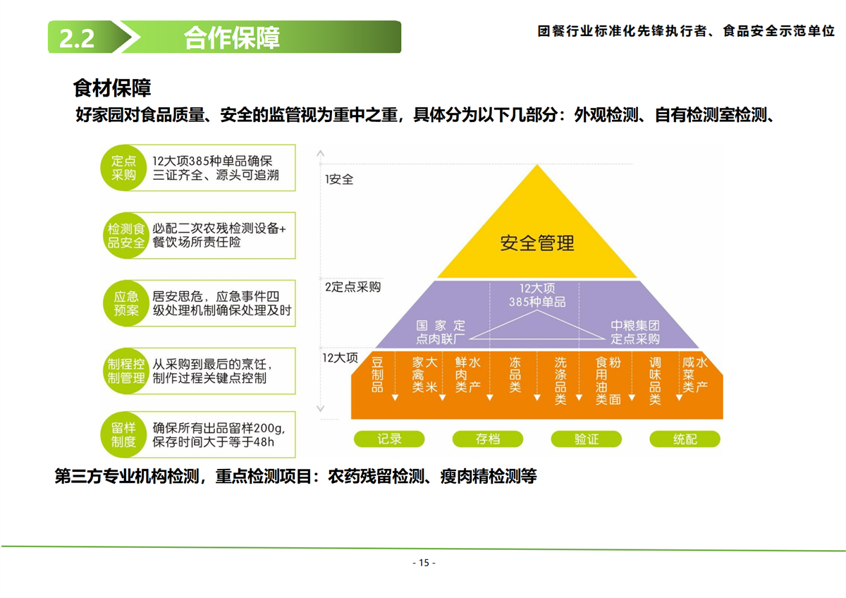公司自有食材供應鏈中心和全程生鮮冷鏈運輸一體化的配送系統(tǒng),通過整合綠色蔬菜、養(yǎng)殖基地,建立集植、養(yǎng)殖等規(guī)模化生產(chǎn)、標準化管理的可控可追溯基地。通過整合上游供應商,統(tǒng)一采購,統(tǒng) 一加工,統(tǒng)一配送,以科學、合理、規(guī)范的現(xiàn)代化模式為客戶提供安全的高品質(zhì)農(nóng)副產(chǎn)品,構(gòu)建從種子到餐桌全產(chǎn)業(yè)鏈運作。